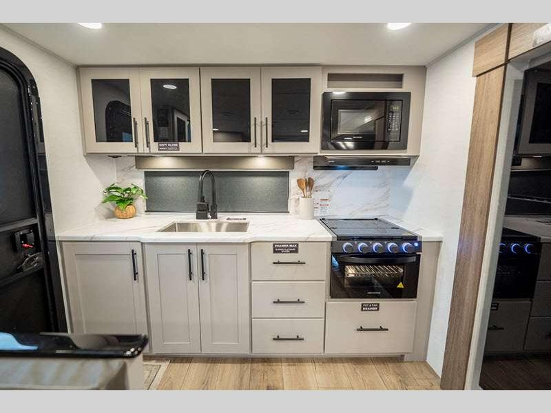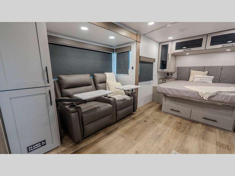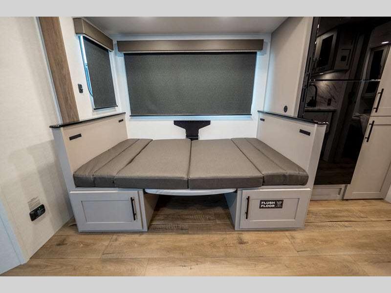 Exterior highlights include Step Above steps on all doors, Goodyear Endurance tires, exterior awning controls, and more. Inside, you'll enjoy fully functional oversized atrium windows, soft closet hidden hinges, and no carpet to make cleaning up easier than ever.