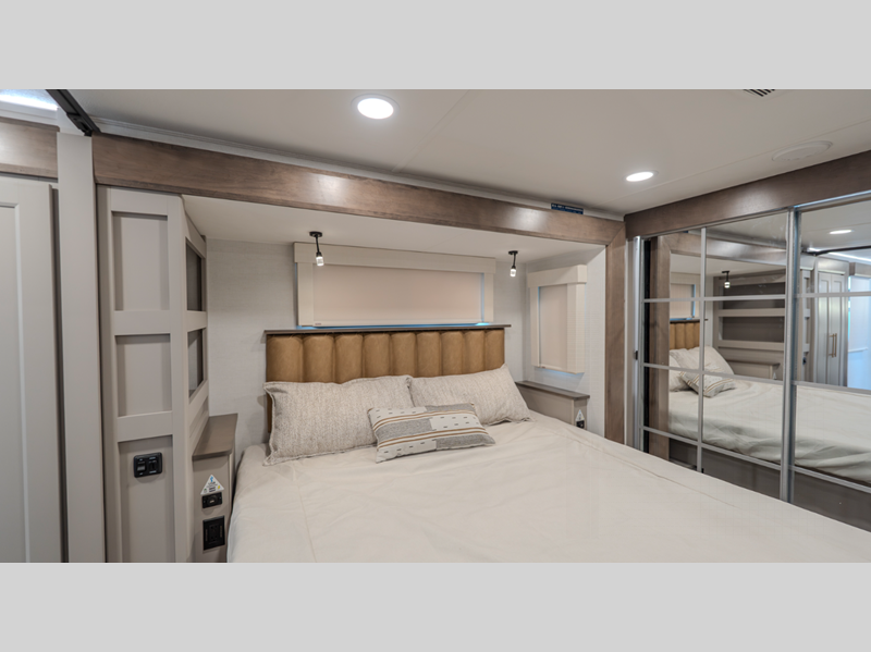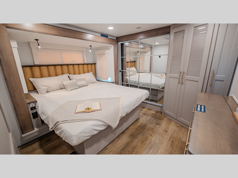 Sleeps 8 Slides 4 Length 42 ft 6 in Ext Width 8 ft 5 in Ext Height 13 ft 6 in Exterior Color Standard Paint/Graphics. Optional Full-Body Paint; Gold, Black Hitch Weight 3179 lbs GVWR 18000 lbs Dry Weight 15278 lbs Fresh Water Capacity 98 gals Grey Water Capacity 159 gals Black Water Capacity 106 gals Tire Size 16" Furnace BTU 40000 btu Available Beds King, Queen Refrigerator Type 12 Volt Residential Refrigerator Size 19 cu ft Cooktop Burners 4 Shower Size 48" x 30" and 30" x 36" Number of Awnings 2 Axle Weight 7000 lbs LP Tank Capacity 60 lbs. Water Heater Capacity 12 gal Water Heater Type Gas/Electric AC BTU 40500 btu TV Info LR 50" Smart TV, BR Smart TVs Awning Info Friction-Hinge Adjustable Solera with Manual Override and LED Lights Washer/Dryer Available Yes Shower Type Standard Electrical Service 50 amp Similar Floorplans