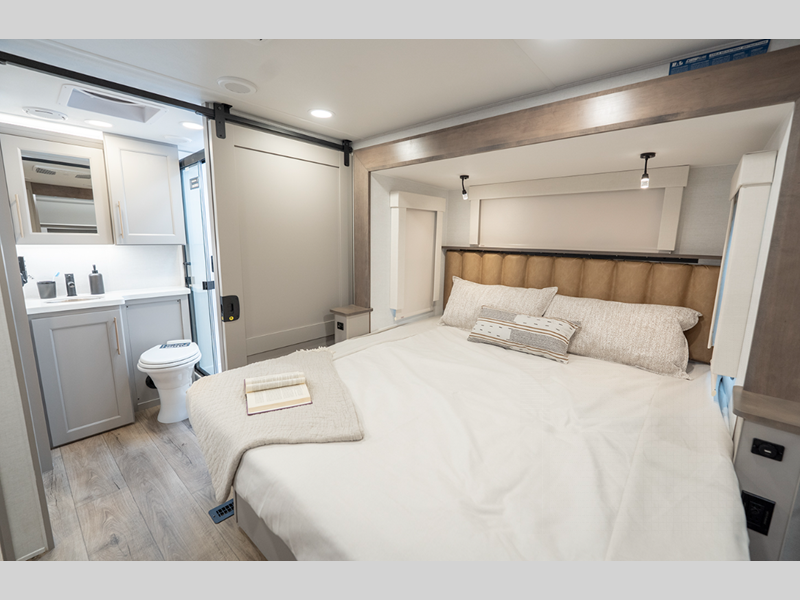 The Benchmark 8' 5" wide-body chassis, Mylar reinforced exterior seals, and insulated laminated rear wall will provide a durable fifth wheel made to last. There is a TSC - Touring Coil Suspension and Curt 8,000 lb. axles for the ultimate towing experience, and the 6-point hydraulic leveling will make set-up easier than ever. Head inside to find bronze hardware, atrium windows, a large residential shower, and roller shades throughout to provide privacy when you want it.