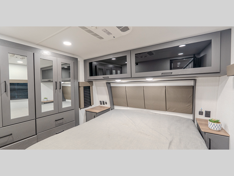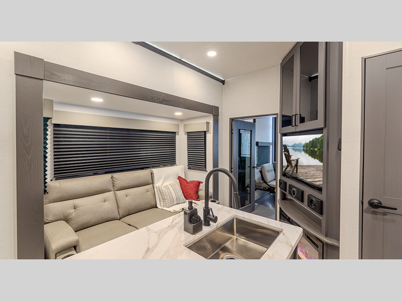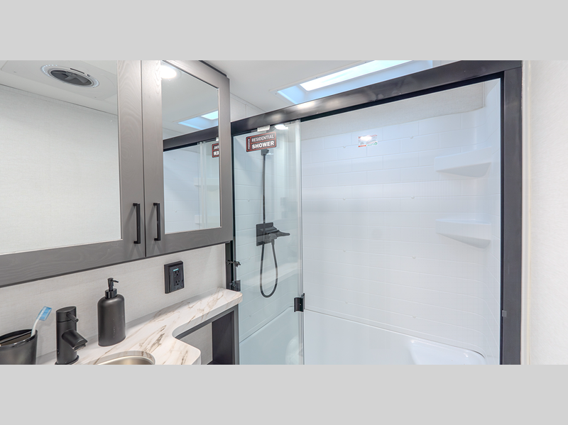 The 101" wide-body benchmark chassis provides plenty of space to bring along the dirt bikes, four-wheeler, or kayaks, and the Azdel-backed fiberglass sidewalls are ultra durable so you can enjoy your RV for years to come. You will appreciate the Garage Management System that includes a weather resistant ramp door, a fully insulated garage floor, and a multi-point tie-down system to keep your toys secure during transport. The interior will have you feeling at home with black cabinetry hardware, residential LED recessed ceiling lights, a large residential shower, and many more comforts.