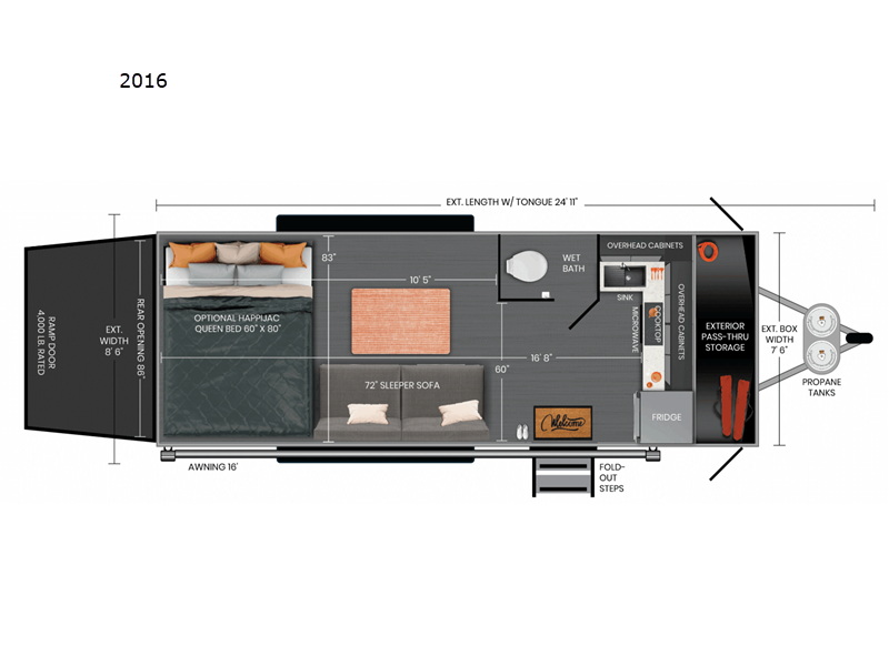 Sleeps 2 Length 24 ft 11 in Ext Width 8 ft 6 in Ext Height 10 ft 6 in Int Height 7 ft Exterior Color Polar White, Black, Silver Frost, Medium Charcoal, Light Pewter Metallic Hitch Weight 875 lbs GVWR 7700 lbs Dry Weight 4850 lbs Cargo Capacity 2850 lbs Fresh Water Capacity 50 gals Grey Water Capacity 45 gals Black Water Capacity 45 gals Tire Size 205/75E15LRD Furnace BTU 19000 btu Refrigerator Type 12V Refrigerator Size 6.2 cu ft Convection Cooking Yes Cooktop Burners 2 Number of Awnings 1 Axle Weight 3500 lbs Garage Size 16 ft 8 in LP Tank Capacity 20 lbs Water Heater Capacity 6 gal Water Heater Type DSI LP Gas/Electric AC BTU 15000 btu Awning Info 16' Power w/Light Strip Axle Count 2 Number of LP Tanks 2 Shower Type Wet/Bath Shower Electrical Service 30 amp Similar Floorplans