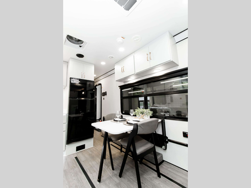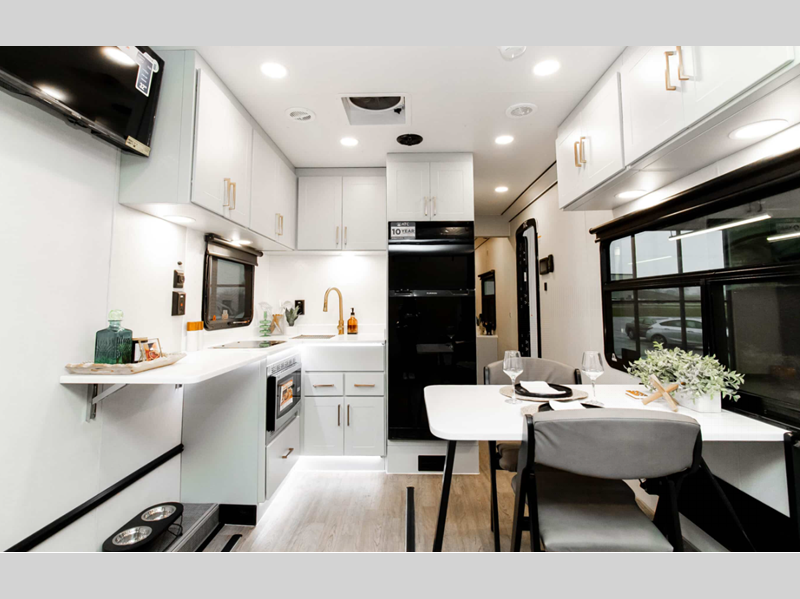 Sleeps 2 Length 34 ft Ext Width 8 ft 6 in Ext Height 11 ft 6 in Int Height 7 ft 6 in Exterior Color White, Silver Frost, Pewter, Charcoal, Black Hitch Weight 1245 lbs GVWR 13200 lbs Dry Weight 8600 lbs Cargo Capacity 4600 lbs Fresh Water Capacity 100 gals Grey Water Capacity 45 gals Black Water Capacity 45 gals Tire Size 235/80R16E Furnace BTU 25000 btu Available Beds Queen Refrigerator Type 12V Refrigerator Size 10 cu ft Convection Cooking Yes Cooktop Burners 2 Shower Size 28" x 36" Number of Awnings 1 Axle Weight 6000 lbs Garage Size 15 ft 7 in LP Tank Capacity 20 lbs Water Heater Capacity 6 gal Water Heater Type LP Gas/Electric AC BTU 30000 btu TV Info LR 32" Smart TV Awning Info 25' Electric with Light Strip Axle Count 2 Number of LP Tanks 2 Shower Type Standard Similar Floorplans