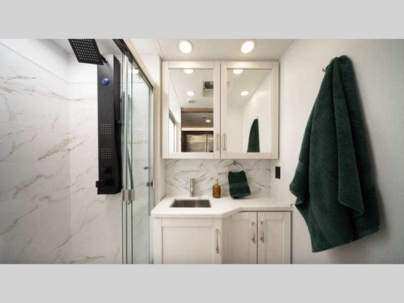 Sleeps 5 Slides 3 Length 39 ft 4 in Ext Width 8 ft 5 in Ext Height 13 ft 4 in Int Height 7 ft Interior Color Brookside, Farmhouse Exterior Color Afternoon, Daybreak, Dusk, Midday, Moonless Night, White Night Hitch Weight 12000 lbs GVWR 31000 lbs Fresh Water Capacity 72 gals Grey Water Capacity 81 gals Black Water Capacity 50 gals Tire Size 275/80R 22.5 Furnace BTU 30000 btu Generator 8,000-watt Quiet Diesel Fuel Type Diesel Engine Cummins ISB 6.7L Chassis Freightliner S2RV Horsepower 360 hp Fuel Capacity 100 gals Wheelbase 279 in Number Of Bunks 1 Available Beds King Torque 800 ft-lb Refrigerator Type Residential Convection Cooking Yes Cooktop Burners 2 Shower Size 30" x 36" Number of Awnings 1 Axle Weight Front 10000 lbs Axle Weight Rear 21000 lbs LP Tank Capacity 24.5 gals Water Heater Type Suburban tankless AC BTU 30000 btu TV Info LR 50" LED HD Smart TV Lift, BR LED HD Smart TV, Ext. LED HD Smart TV Awning Info 23' Electric w/ LED Lights Washer/Dryer Available Yes Gross Combined Weight 43000 lbs Shower Type Standard Electrical Service 50 amp Solar Wattage 200 watts Similar Floorplans