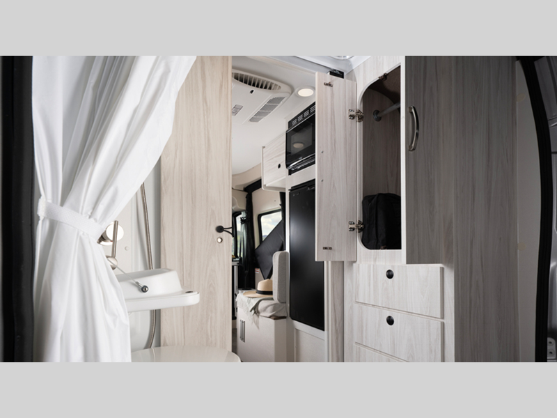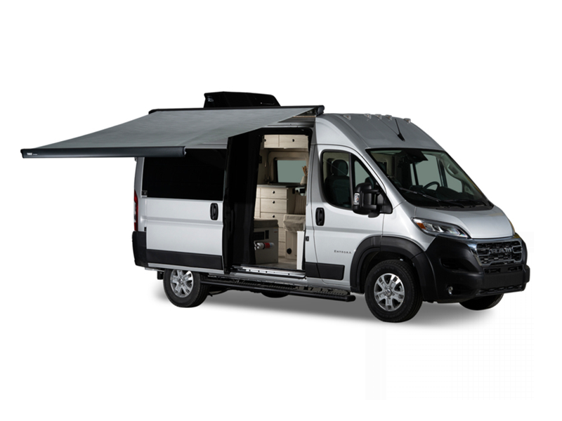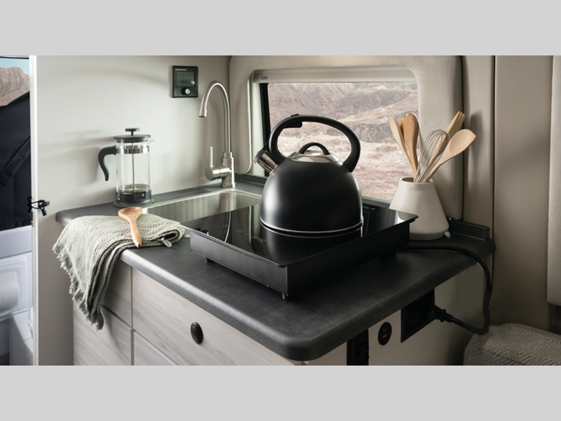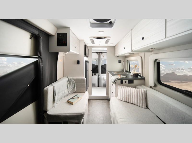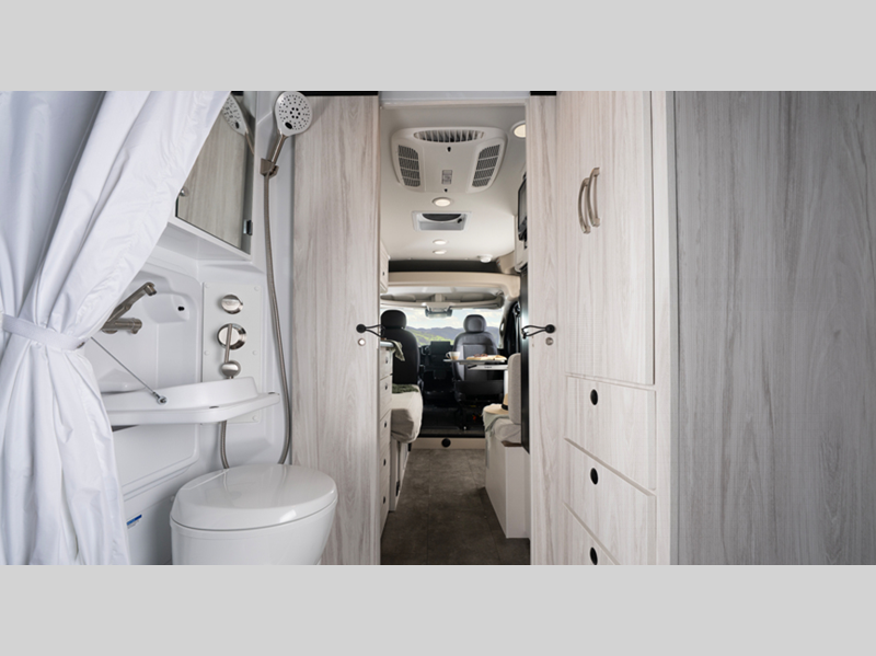 Some of the stand out features you'll enjoy with this camper van are the Aqua-Hot hydronic water and heating system, the ParkView rear backup camera, and the collision mitigation with LaneSense. You will love having a Thule awning with LED lights outside, along with an outside shower, sliding vented windows, and two 120V outlets. A 2,800W gas generator and 1,000W inverter also comes standard to keep you powered up, and you're sure to enjoy the residential vinyl flooring inside, along with pressed countertops and a convenient wet bath.