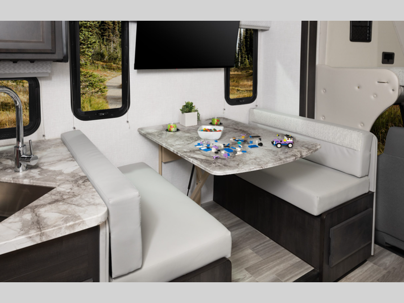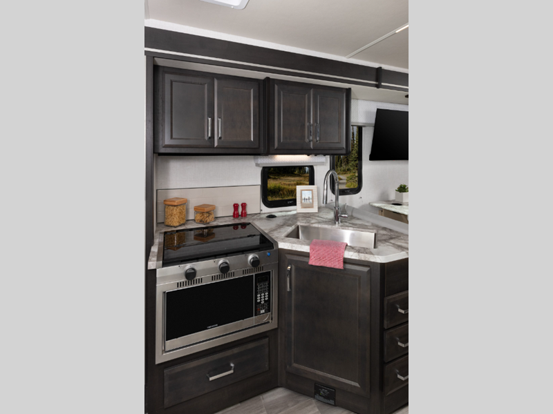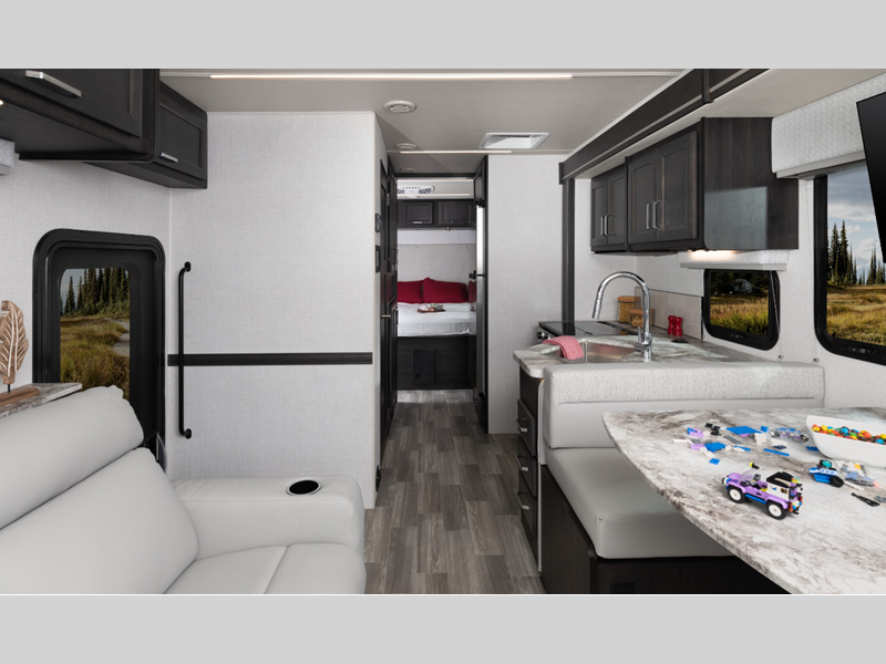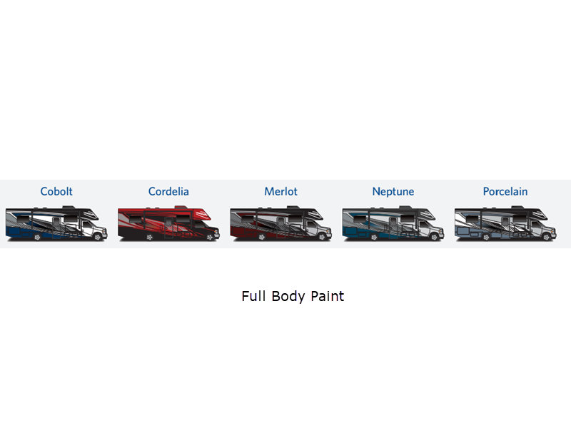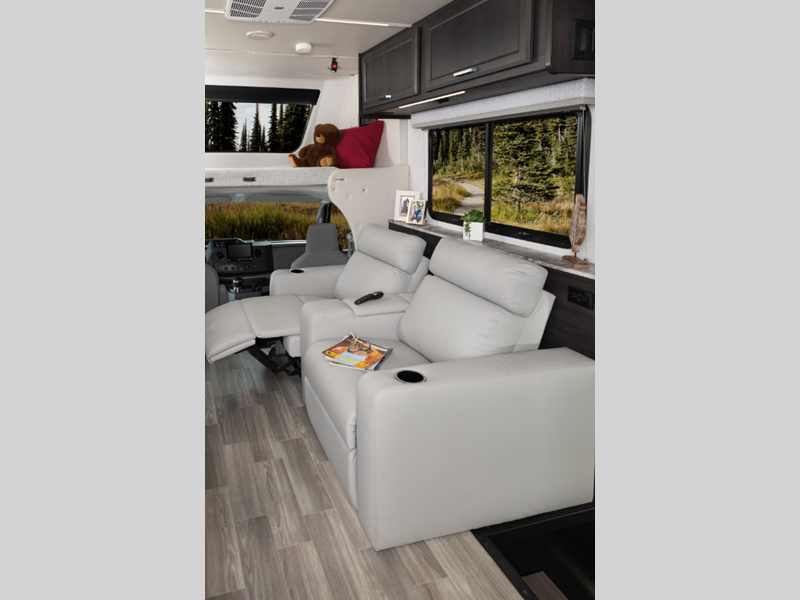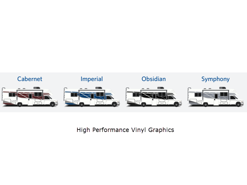 Each model sits on a durable Ford E-450 chassis with a 7.3L V8 engine, along with premium grade tuff coat vacu-bonded sidewalls and modern exterior vinyl graphics. Inside, you will love the premium galley appliances, durable marine grade flooring, and the residential style sofa by Apex Custom Furniture.