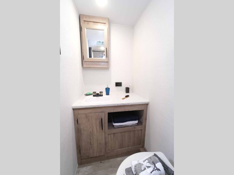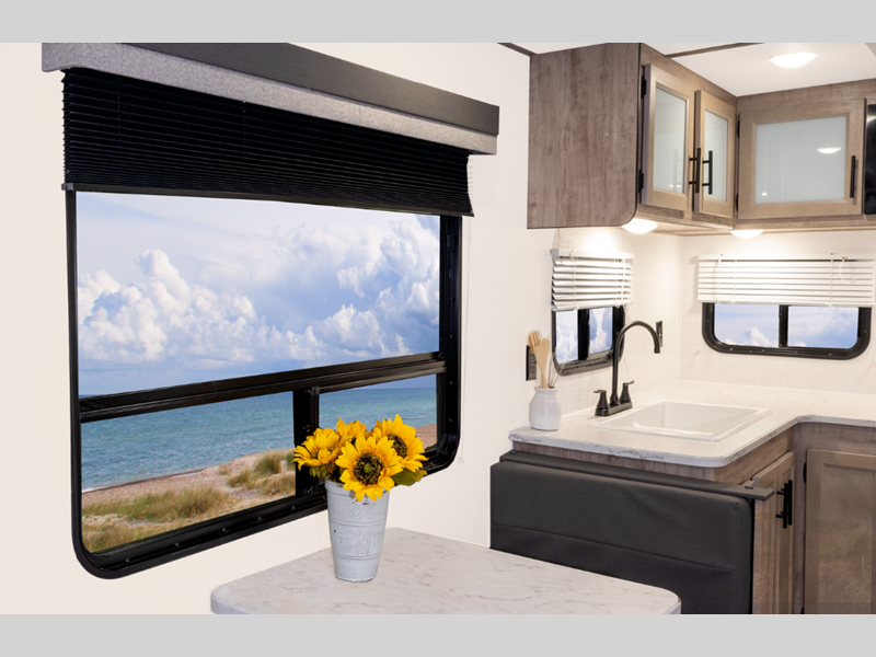 The seamless synthetic vinyl roof and diamond plate lower front provide a durable trailer made to last, and the high-performance vinyl flooring throughout will be easy to keep clean. Each model includes LED interior lights, wood ceiling trim, laminated countertops with vinyl T-molding, and many more interior comforts. You will also appreciate the tankless water heater, the multiple USB ports to keep your electronics charged, and the power awning that will provide shade while you visit outdoors.