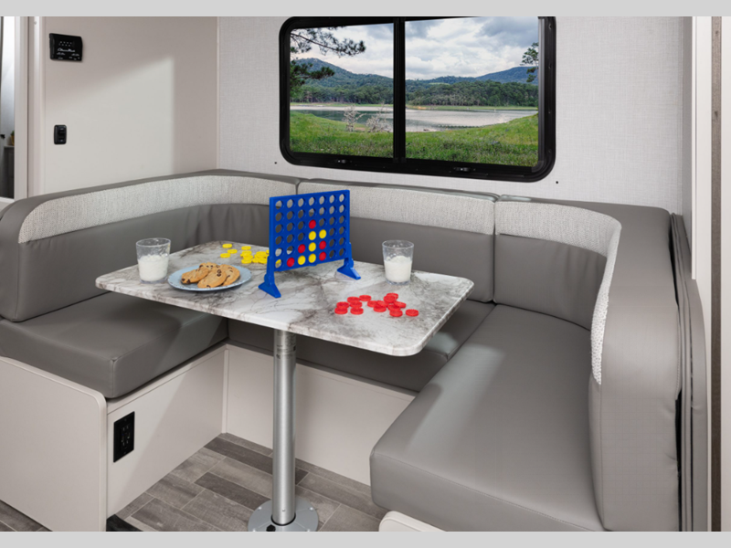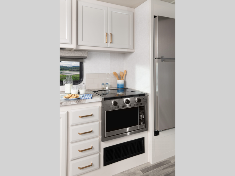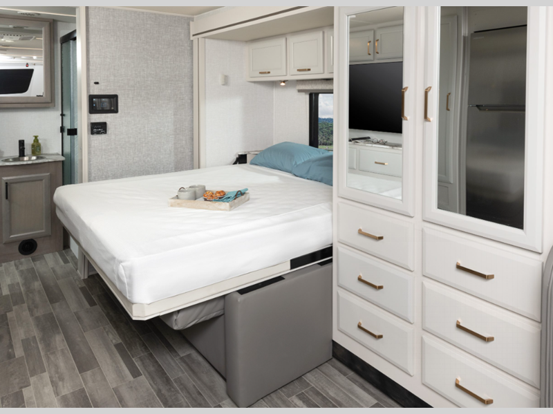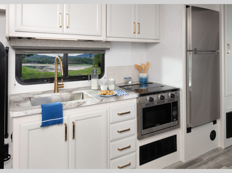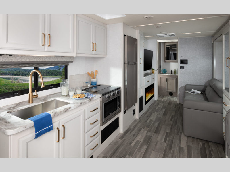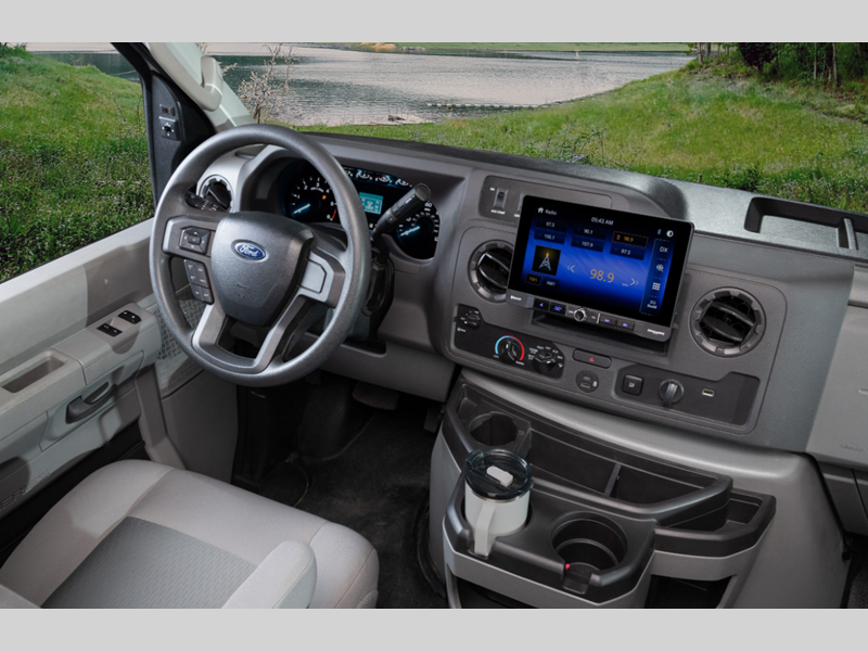 Each model sits on an E-450 Ford Chassis with a Ford 7.3L V8 engine to power your adventures both near and far. The Vacu-Bond floors, walls and ceilings with a Powerlock System ll create a strong foundation to your coach, and the premium color gel high-gloss exterior is sure to turn heads as you travel across the state or country. Designer pleated shades, lino flooring, and kitchen backsplash will make your space feel more like home, while a 15,000 BTU A/C and 30,000 BTU furnace will keep you comfortable year around.