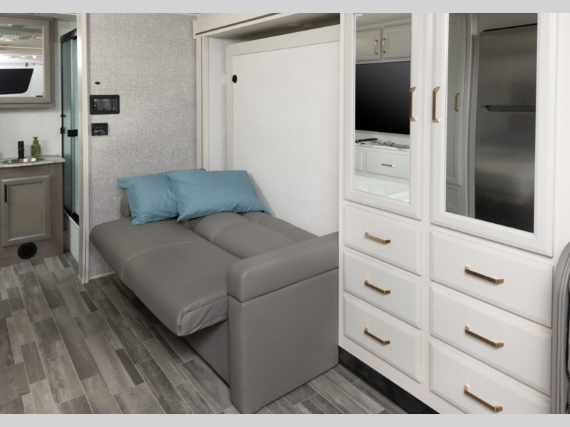 Sleeps 8 Slides 2 Length 32 ft 6 in Ext Width 8 ft 6 in Ext Height 11 ft 7 in Int Height 7 ft Interior Color Roam, Cruise, Tour Exterior Color Estate, Midnight, Morning Fog, Vapor Hitch Weight 7500 lbs GVWR 14500 lbs Fresh Water Capacity 50 gals Grey Water Capacity 36 gals Black Water Capacity 36 gals Tire Size LT225/75R16E Furnace BTU 30000 btu Generator 4,000W Onan Quiet Fuel Type Gas Engine 7.3L V8 Chassis Ford E-450 Horsepower 325 hp Fuel Capacity 55 gals Wheelbase 223 in Number Of Bunks 1 Available Beds Queen Torque 450 ft-lb Refrigerator Type Stainless Steel Residential Convection Cooking Yes Cooktop Burners 3 Number of Awnings 1 Axle Weight Front 5000 lbs Axle Weight Rear 9600 lbs LP Tank Capacity 16 gals. Water Heater Type Tankless AC BTU 15000 btu Basement Storage 44 cu. ft. TV Info LR LED TV Awning Info 22' Gross Combined Weight 22000 lbs Shower Type Standard Electrical Service 50 amp Similar Floorplans