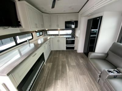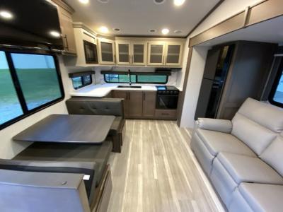 You'll be met with residential features inside, such as night roller shades throughout, decorative crown molding, and durable one-piece DynaSpan flooring. The Climate Guard Protection Package will help extend your camping season so you can travel in colder months, and there are added safety features for your peace of mind.