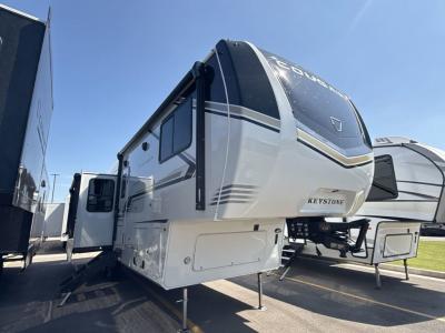 Sleeps 5 Slides 3 Length 33 ft 8 in Ext Height 13 ft 4 in Exterior Color Black Onyx Midnight, Phantom Gray Midnight, Hero Edition Options Hitch Weight 2060 lbs Dry Weight 10567 lbs Cargo Capacity 2333 lbs Fresh Water Capacity 75 gals Grey Water Capacity 76 gals Black Water Capacity 38 gals Tire Size ST235/80R16E Furnace BTU 30000 btu Available Beds Queen Refrigerator Type 12V Refrigerator Size 16 cu ft Cooktop Burners 3 Number of Awnings 2 LP Tank Capacity 30 lbs Water Heater Type Tankless On Demand AC BTU 15000 btu TV Info LR LED HDTV Awning Info 10' & 15' Electric with Gas Strut Arm with Dotless Neon Style LED Lighting Axle Count 2 Washer/Dryer Available Yes Number of LP Tanks 2 Shower Type Standard Electrical Service 50 amp Similar Fifth Wheel Floorplans