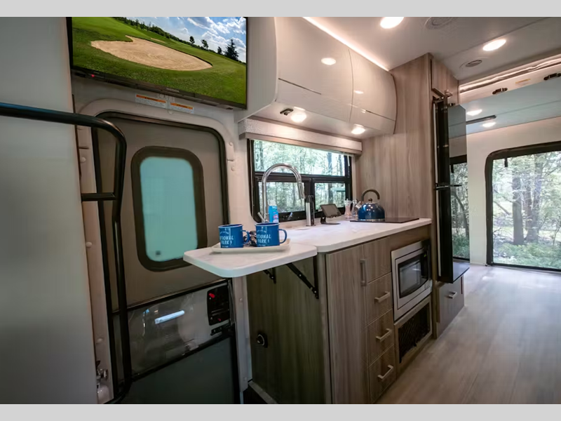 Sleeps 3 Slides 1 Length 23 ft 7 in Ext Width 7 ft 6 in Ext Height 11 ft Int Height 6 ft 8 in Interior Color Freshwater Pearl, Snow Leopard Exterior Color Standard Graphics on HD Max. Brilliant Carbon, River Ranch, Seashell Grey Full-Body Paint Choices Hitch Weight 5000 lbs GVWR 11000 lbs Fresh Water Capacity 31 gals Grey Water Capacity 37 gals Black Water Capacity 19 gals Furnace BTU 19000 btu Generator 50 State 4.0 kW Gas Fuel Type Gasoline Engine 3.5L V6 EcoBoost Turbo Chassis Ford Transit AWD Horsepower 310 hp Fuel Capacity 25 gals Wheelbase 156 in Available Beds Flip-Up RV Queen Torque 400 ft-lb Refrigerator Type 12V Dual Door Convection Cooking Yes Cooktop Burners 2 Shower Size 24" x 32" Number of Awnings 1 LP Tank Capacity 40.9 lbs Water Heater Type Tankless AC BTU 15000 btu Basement Storage 15.1 cu. ft. TV Info LR 32" Smart TV, BR 32" Smart TV Awning Info 14' Power w/Integrated LED Lighting Gross Combined Weight 15000 lbs Shower Type Standard Electrical Service 30 amp -