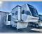 The front kitchen in this fifth wheel is a chef's dream come true while camping! There is generous counter space up front and beside the range, plus a pantry and 12V refrigerator with an ice maker. There is also a hi-top table with two bar stools that overlooks the living area. Inside the living area there are opposing sofa sleeper slides and power theater seating across from an entertainment center with a 50" Smart TV. A mid-coach half bath is easily accessible, and the full rear bath with dual bath sinks will create a master bedroom you are sure to love. There is a king bed slide out, a wardrobe, hamper, and a TV/storage.