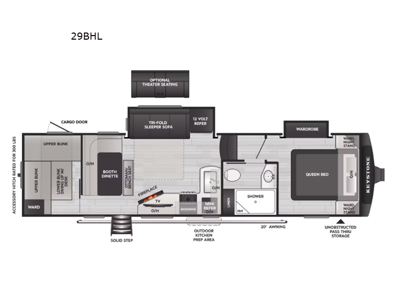 - Full pass through storage with LED light strip, power outlets and TV hookups