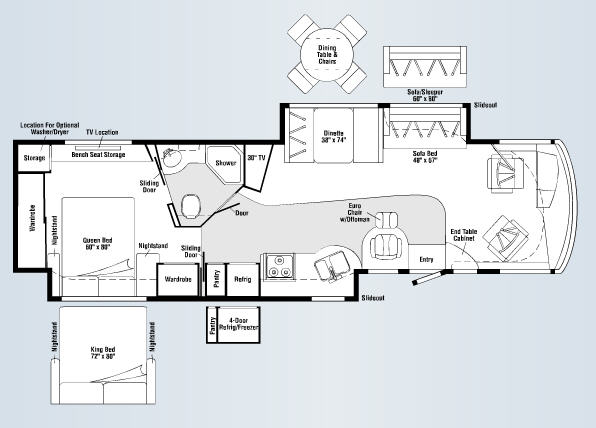 Double Slide, Bedroom & Galley Slideout w/Queen or Opt. King Bed/Nightstands/Wardrobe/Pantry/Refrigerator w/4 Door Opt./3 Burner Range & Double Kitchen Sink Super Slide, Euro Chair w/Ottoman, Corner End Table Cabinet, Booth Dinette or Opt. Round Dinette & Chairs w/Sofa Bed Slideout, 30" TV, Angle Shower, Lav., Med. Cabinet, Double Bath Entrance, Bench Seat Storage in Bedroom & Opt. Washer/Dryer, Opt. Freightliner Chassis and Much More.