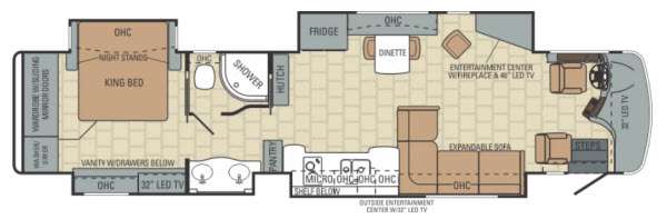 Along the passenger side of the motor home you will find a slide with an expandable sofa, double kitchen sink, two burner range, and microwave. Next to the slide you will find a pantry. On the opposite side of the motor home there is a slide with an entertainment center, fireplace and 46" LED TV, dinette, and refrigerator. Next to the slide you will find a nice size hutch.