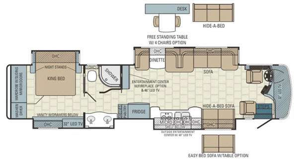 Along the passenger side of the motor home you will find a slide with a hide-a-bed, double kitchen sink, two burner range, and microwave. In place of the hide-a-bed sofa you can choose an easy bed sofa with table. Next to the slide there is a refrigerator and pantry. Next to the slide there is an entertainment center with a fireplace and a 46" LED TV. The opposite side of the motor home has a sofa and dinette ensemble or you can choose an optional free-standing table with chairs and a hide-a-bed.