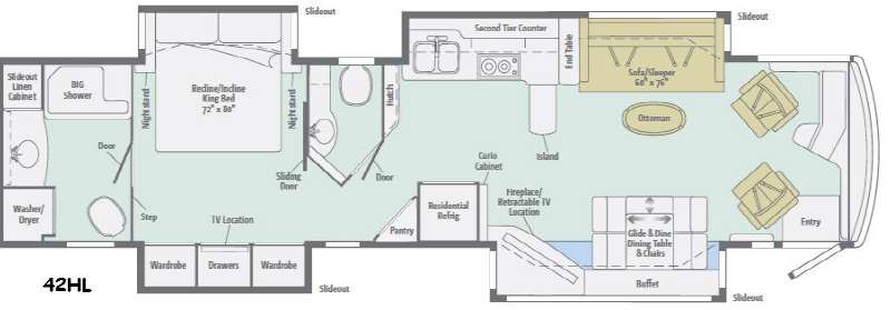 Step inside model 42HL just in front of the passenger captain chair that swivels around. You will see a luxurious living space as you look through the coach to the rear. To your immediate left find a slide out Glide and Dine dining table and chairs along with a buffet and corner retractable 50" HDTV with fireplace.