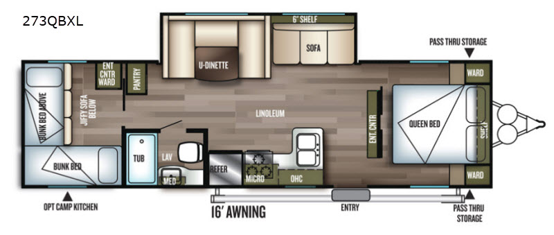 You will want each camping trip to extend just a little bit longer when you choose to camp with this Wildwood X-Lite 273QBXL. Your kids will enjoy the rear bunkhouse which has three bunk beds plus a jiffy sofa below one bunk. While the chef in the family is fixing the meals you can easily visit with your family since the kitchen and living area are open and spacious with the single slide out. You can enjoy your meals at the u-dinette and at night this converts into additional sleeping space. The front bedroom is ideal for mom and dad. Here they can get a good night's rest on the queen bed plus there is storage with the wardrobes and overhead shelf. Maybe you prefer more time outdoors then you will want to add the optional camp kitchen!