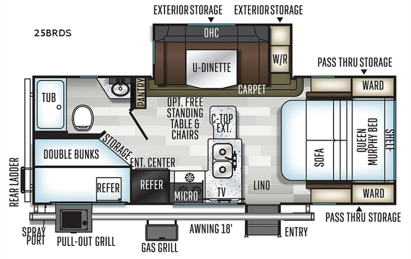 Load up your family of eight and head out to the campground of your choice with this travel trailer in tow! The kids will enjoy the double bunk beds so they can invite their friends or cousins. This unit features a slide out with the large U-shaped dinette that you can gather around for family game night. Relax on the sofa and visit with friends and at night you can convert the sofa into a Murphy bed. Everyone will appreciate the rear corner bath for a little extra privacy, plus the bath includes a tub for the little ones. Enjoy time outdoors with a pull-out grill, a spray port and a refrigerator for dinner under the stars. This travel trailer also includes a pass through storage and exterior storage, so you don't have to leave anything behind.