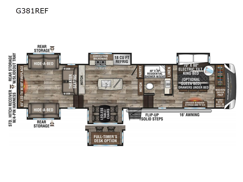 With any Durango Gold fifth wheels by KZ you will have flexible, puncture resistant, and reflective Tufflex roofing material, six-sided aluminum framing, and a heated, insulated and enclosed underbelly to travel all year long. Each model features a fully-vented attic system with two attic vents providing vital escape routes for unwanted moisture, and the Durango Towing package which includes a 2" towing receiver hitch with 4-pin wire harness connection, a 3,000 lb. tow rating, and 300 lb. hitch rating. The lithium-ready charging station includes a dual converter allowing you to flip a switch to choose between lithium or lead batteries. The interior offers outstanding features such as theater seating with cupholders, a USB plug, heat, massage and power recline/decline, an under-mount bathroom stainless steel sink with waterfall faucet, bedroom cabinetry with built-in hamper, and a Gold's 70" x 80" walk-around electric-tilt king bed with underbed drawers for extra storage. The list keeps going, choose your favorite Durango Gold today for luxury full-time traveling!