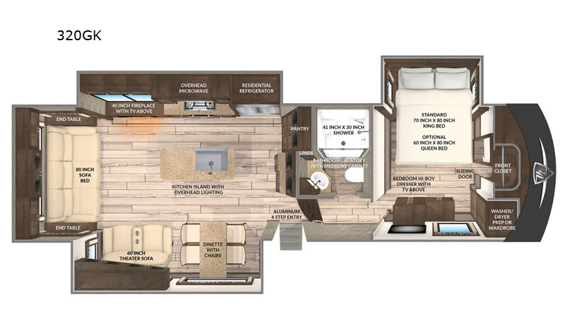Pack your bags and head to your favorite state park in this fifth wheel made just for you. The dual opposing slides in the main living area create an open floor plan, and the kitchen island with overhead lighting will provide the chef of the family plenty of counter space. The 60" theater sofa sits directly across from the 50" LED TV and fireplace, plus there is an 80" sofa bed that will be prefect if the grandkids tag along. Freshen up each day in the full bath that includes a spacious 41" x 30" shower, and a medicine cabinet for your necessities. You and your spouse will feel right at home in the front private bedroom with its slide out king bed, Hi-Boy dresser with a TV, plus a large front closet for tons of storage space!