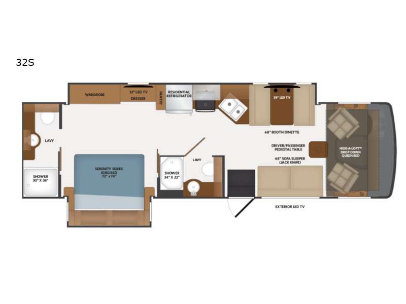 You can use this Flair Class A gas motorhome to see national landmarks or to travel to weekend tournaments! With two full bathrooms, this coach is amazingly luxurious, and one of those bathrooms creates a master suite with the private bedroom. If you have kids or friends traveling with you, they can use the 68" booth dinette, 68" sofa sleeper, and Hide-A-Loft drop-down queen bunk to rest, and everyone can benefit from the meals that will be prepared on the three-burner range in the kitchen. Snag some late-night snacks from the residential refrigerator or pantry, and head outside to watch a movie under the stars on the exterior TV. You'll also love staying inside because the full-wall slide will give you plenty of living space.