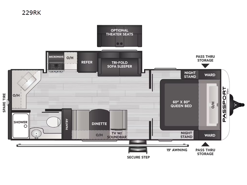 You can take many different kinds of trips with this Passport SL travel trailer! Once you get to the campsite and set up the 19' awning, you can remove your travel gear from the exterior pass-through storage to create your own little retreat. On the interior, the front private bedroom provides you with a queen-size bed, nightstands, and bedside wardrobes so that you can easily get changed every morning and night. The large slide out in the main living area will add to the amount of living space on the interior without adding to the overall width of the trailer. As the night comes to a close, you can heat up a bag of popcorn in the microwave before sitting down in the tri-fold sofa sleeper which could be switched out for the optional theater seating.